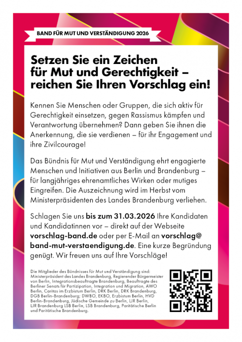 Noch bis zum 31.03.2026 können Kandidat*innen vorgeschlagen werden – direkt auf der Webseite vorschlag-band.de oder per E-Mail an vorschlag@band-mut-verstaendigung.de. Eine kurze Begründung genügt. Ausgezeichnet werden insbesondere Menschen oder Initiativen, die mutig für andere reagieren, sich ehrenamtlich in Berlin oder Brandenburg engagieren und dafür (noch) keine größere Öffentlichkeit haben.