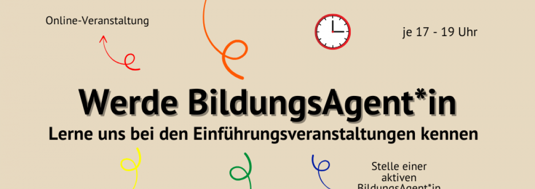 Dann komm zu unserer Einführungsveranstaltung! In zwei Stunden erfährst Du alles Wichtige rund um die BildungsAgent*innen, wer wir sind, wie die Workshops zustande kommen und mehr.
