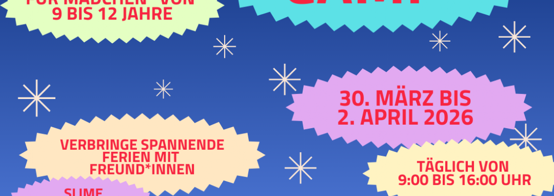 Mädchen von 9 bis 12 Jahre erleben täglich von morgens bis nachmittags ein buntes Ferienprogramm voller Kreativität, Spiel und Sport. Viele Workshops und neue Freundinnen treffen – unser Feriencamp bringt Spaß und Abenteuer in deine Osterferien.